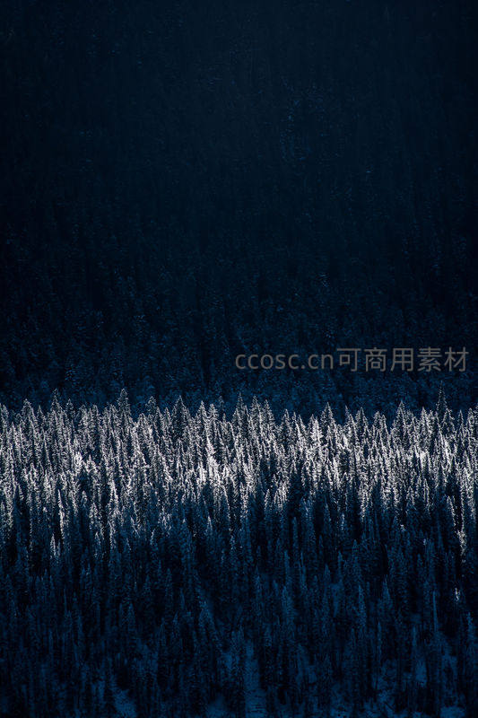 在幽蓝的夜色或晨曦中,整片松林披上厚厚的白雪,万籁俱寂,营造出一种神秘、纯净且寒冷的冬日氛围。