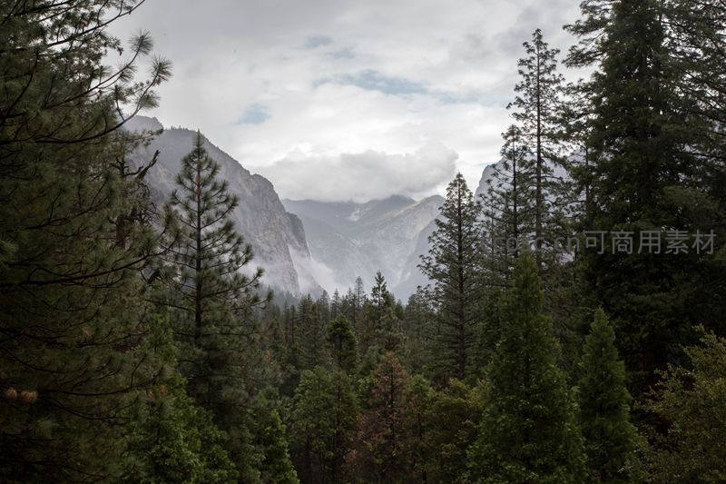 前景是挺拔的松树林,后方巍峨雪山隐现于飘渺云雾之中,层次分明,气势恢宏,传递出高山峡谷的庄严与自然的永恒力量。