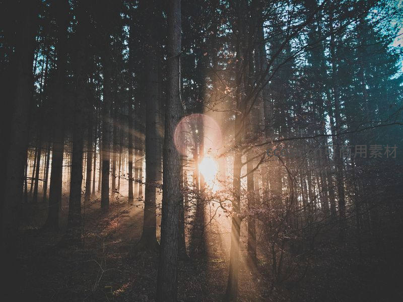 清晨的薄雾中,一缕缕金色阳光穿透树干间隙,在林间投下清晰的光柱,仿佛通往另一个世界的神秘通道。
