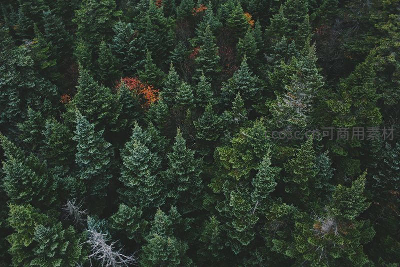 从高空俯瞰,连绵不绝的针叶林如同一片绿色海洋,偶尔点缀着几抹秋色,展现出大自然的壮阔与秩序,令人心旷神怡。