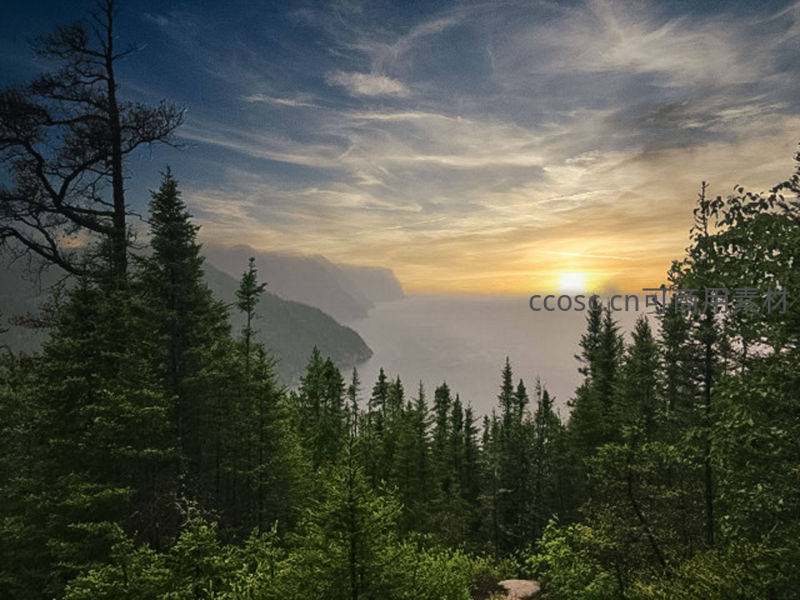 夕阳西下,金色的余晖洒满天际,从高处的松林俯瞰,云海翻腾,远山如黛,构成一幅壮丽的自然画卷。