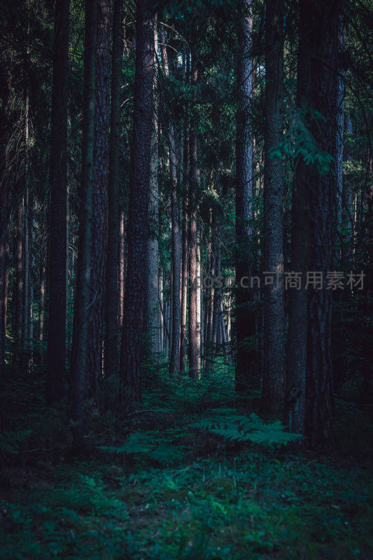 高耸的松树在幽暗中投下斑驳光影,林间小径被翠绿蕨类覆盖,营造出一种远离尘嚣、引人探索的神秘静谧氛围。