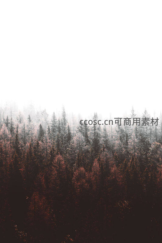 浓雾弥漫于森林之上,将树冠染成一片朦胧的粉红与暗褐,上半部分留白,营造出空灵、诗意且富有层次感的视觉效果。