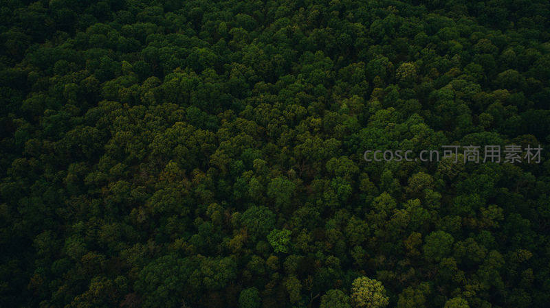 从高空俯瞰,广袤的森林如同一片无边的绿色海洋,每一棵树都紧密相连,展现出原始生态的磅礴气势与生命的蓬勃力量。