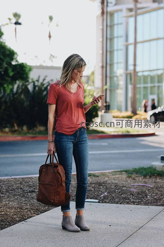 一位穿着红色T恤和牛仔裤的年轻女子站在城市人行道上,低头专注地看着手机,身旁挎着棕色背包,充满生活气息。