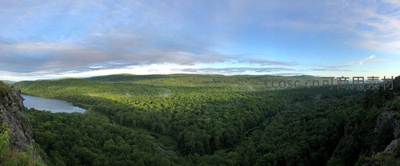 站在高处远眺,蜿蜒的河流静静流淌于苍翠山谷之中,晨雾轻拂林梢,蓝天白云倒映水面,构成一幅和谐宁静的自然长卷。