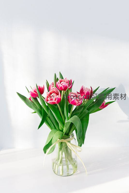 一束粉红色郁金香插在透明玻璃瓶中,用浅色丝带轻轻系住,置于白色台面上,柔和阳光洒落,尽显优雅与活力。