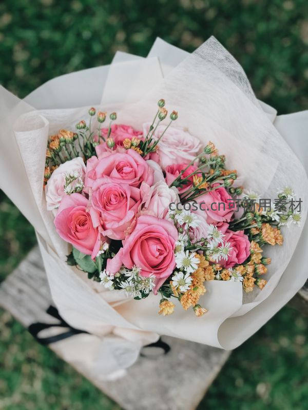 一束由粉红与浅粉玫瑰组成的精致花束,点缀着白色雏菊和黄色小花,用半透明纸温柔包裹,放置于户外木质长凳上,背景是模糊的绿草地,充满春日浪漫气息。