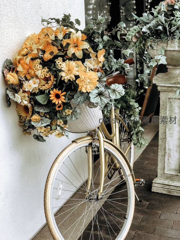 金色自行车篮满载橙黄鲜花如童话般浪漫