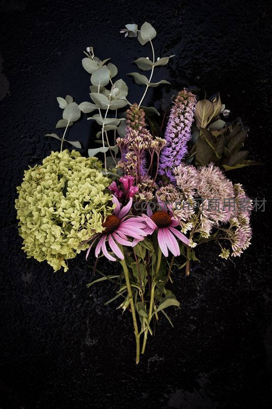 一组由淡绿绣球、粉紫松果菊、薰衣草和尤加利叶组成的花束平铺在湿润的黑色背景上,色彩对比强烈,构图精致,富有艺术感。