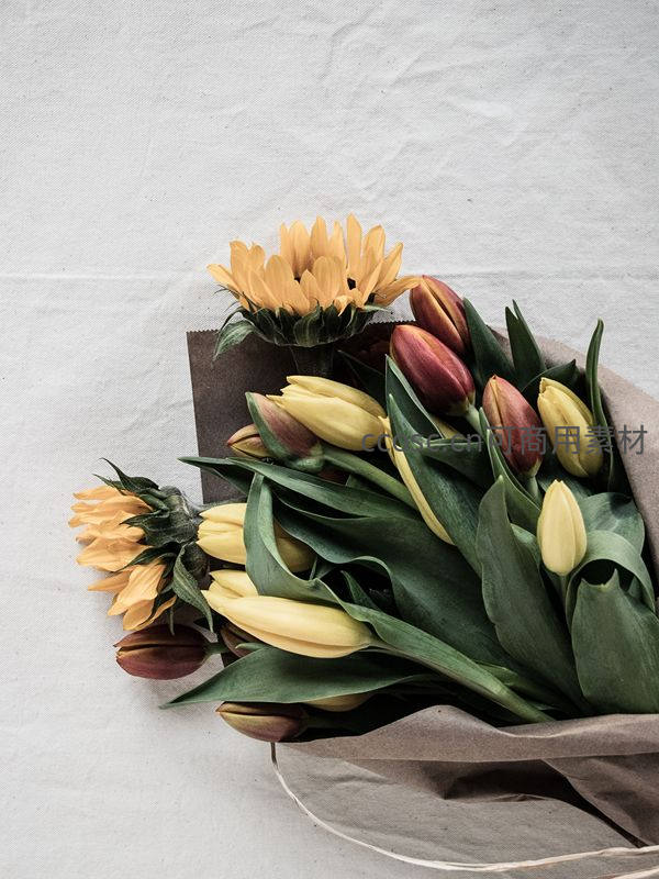 一束由黄色郁金香和向日葵组成的清新花束,搭配翠绿叶片,用棕色纸包裹,置于简约白色布面上,充满自然与温暖气息。