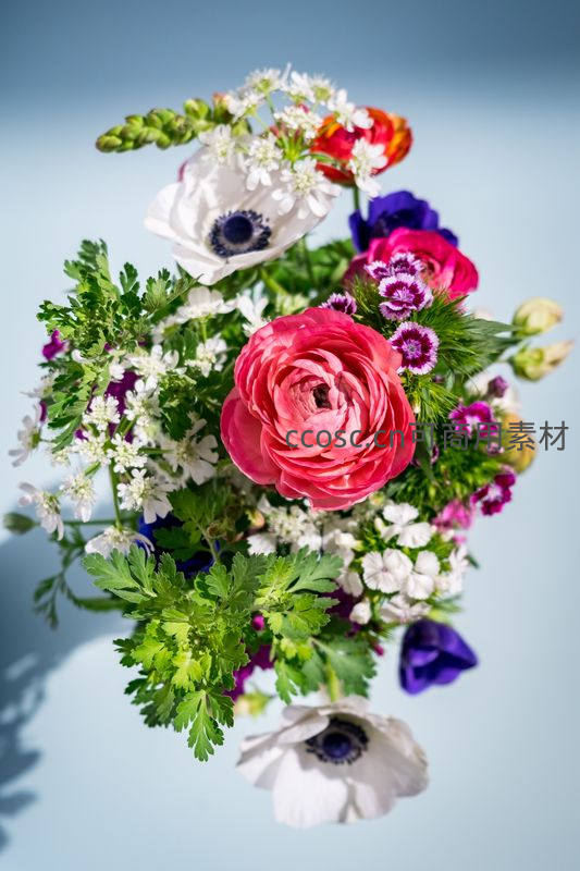 从上方俯瞰一束色彩斑斓的鲜花,包含粉色洋牡丹、白色银莲花和紫色小花,绿叶点缀其间,背景为纯净浅蓝,视觉冲击力强。