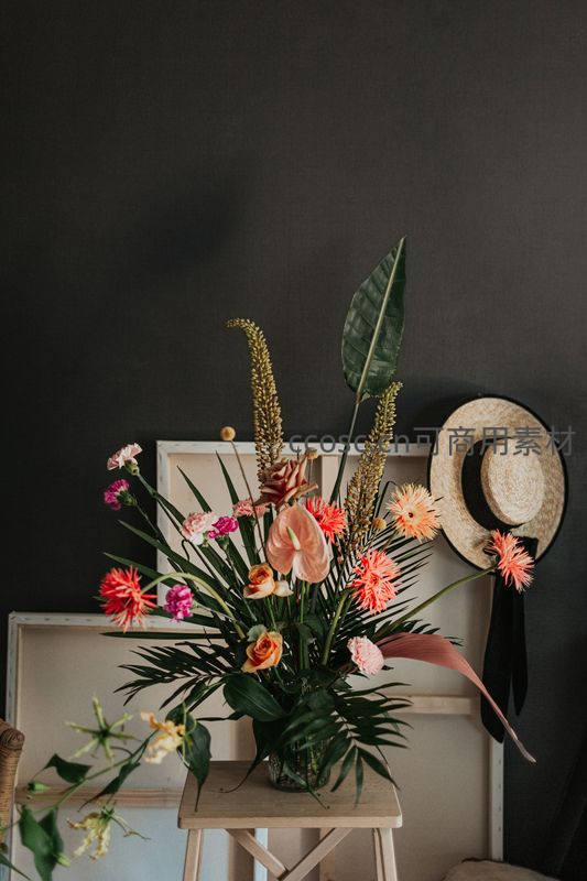色彩鲜艳的热带花卉搭配宽檐草帽,在深色墙面和木质小桌的衬托下,展现出浓郁的艺术感和温馨的居家格调。