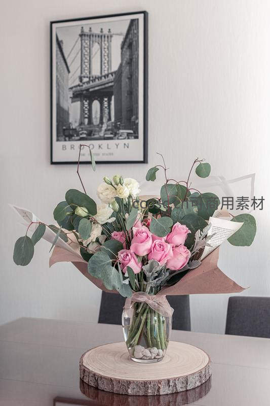 一束粉色玫瑰搭配翠绿尤加利叶,用牛皮纸包裹,置于原木切片托盘上,背景是布鲁克林大桥画作,营造优雅浪漫的用餐环境。