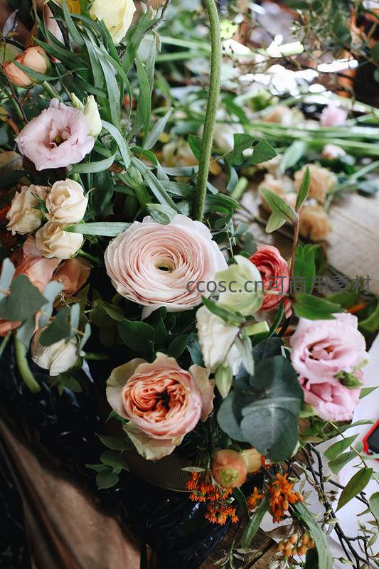 镜头聚焦于盛开的粉色毛茛和洋桔梗,花瓣层层叠叠,绿叶衬托其间,细节清晰,色彩柔和,充满生机与艺术感。