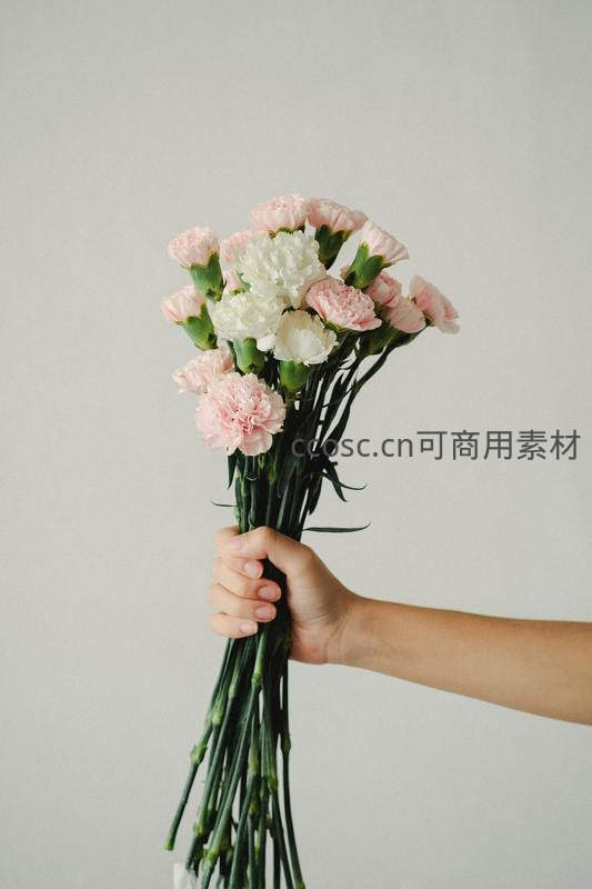 一只纤细的手轻轻握着一束盛开的粉白康乃馨,花朵娇嫩欲滴,背景纯净简洁,突显了鲜花的柔美与送花人内心的温情与祝福。