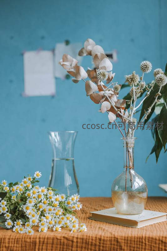 在蓝色墙面前,桌面上摆放着插有干花和雏菊的玻璃花瓶,旁边是翻开的书本,整体构图充满文艺气息,展现了宁静舒适的室内角落。