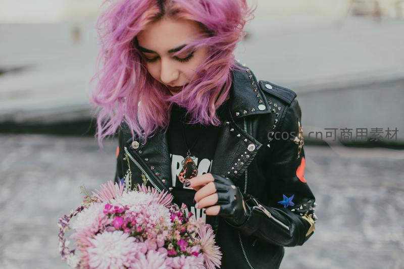 一位拥有鲜艳粉紫色头发的女孩身穿铆钉皮夹克,在街头低头凝视手中色彩缤纷的花束,展现出强烈的个人风格与温柔瞬间的碰撞。