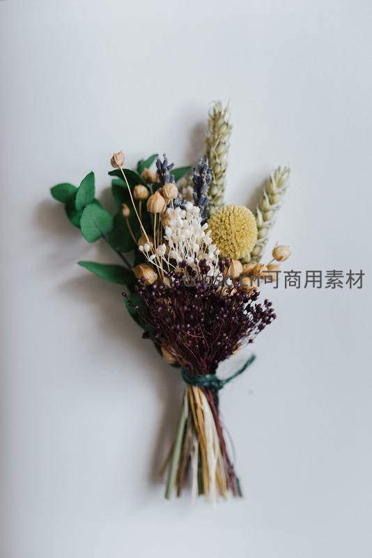 一束由薰衣草、麦穗、满天星等多种干花精心捆扎而成的小花束,平铺在纯白背景上,呈现出自然质朴又不失精致的装饰美感。