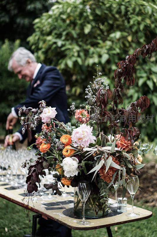 户外花园中,一张铺满鲜花与高脚杯的长桌静待宾客,背景中男士正开瓶侍酒,整体氛围浪漫而高雅,适合庆典或婚礼场合。