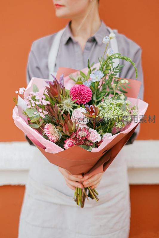 花艺师怀抱春日花束,橙墙映衬温馨时光
