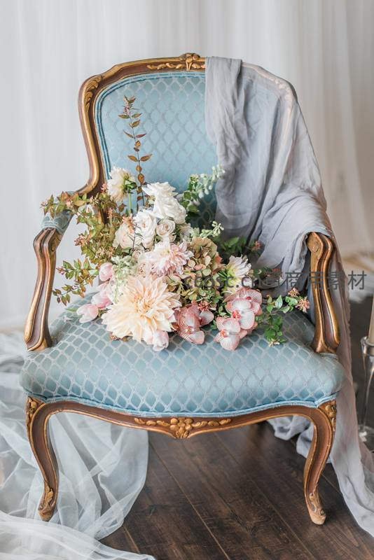 一把古典雕花蓝布扶手椅上摆放着柔和色调的花束,轻纱垂落,营造出梦幻而精致的氛围。