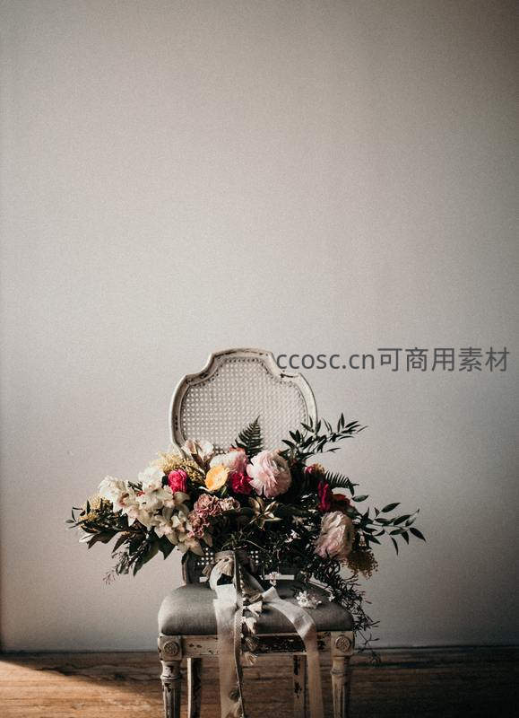 色彩丰富的花束摆放在一张做旧风格的藤编椅上,绿叶与鲜花交织,展现自然与艺术的完美融合。
