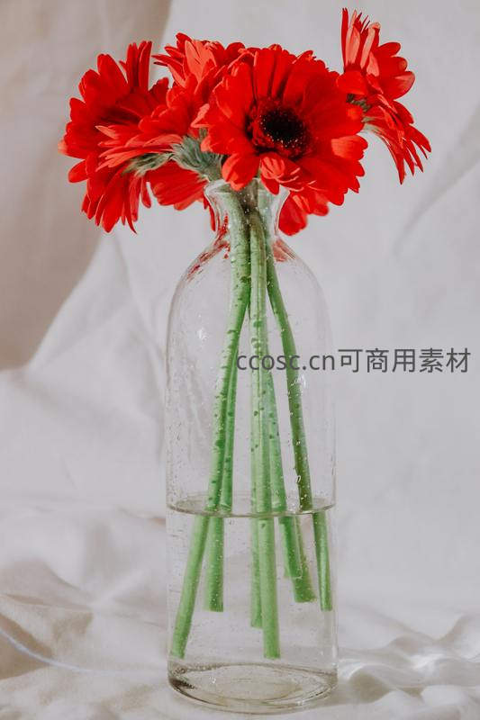 透明玻璃瓶内清水盈盈,几支红艳非洲菊挺立其中,绿色花茎清晰可见,瓶身凝结细小水珠,背景洁白柔软,整体画面纯净优雅。