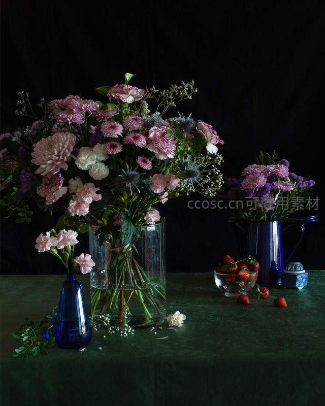 在深绿色桌布和黑色背景的衬托下,粉色与紫色的花束在透明及蓝色花瓶中绽放,旁边点缀着新鲜草莓,营造出宁静而优雅的视觉效果。
