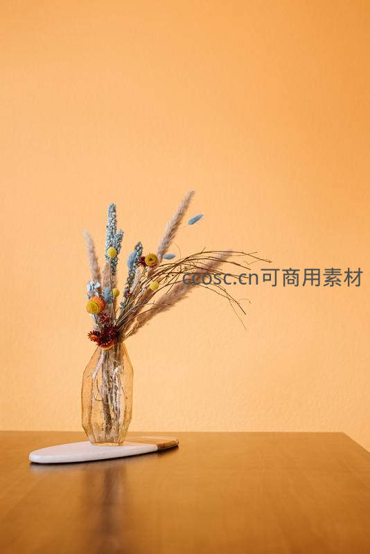 一束色彩斑斓的干花插在透明玻璃瓶中,置于温暖的橙色背景前,搭配原木桌面,整体风格简约温馨,充满艺术感和生活气息。