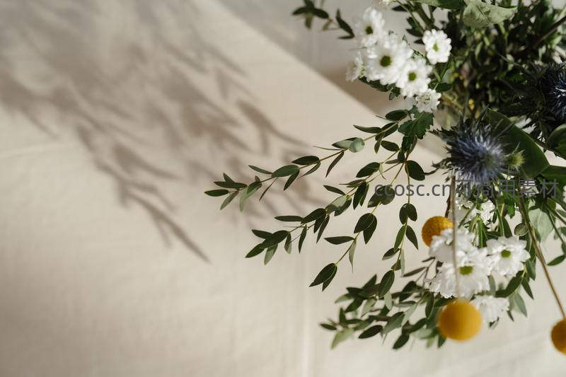 阳光透过枝叶,在米白色墙面上投下斑驳的影子,白菊与尤加利叶交织成画,展现自然光影之美,营造宁静清新的视觉感受。