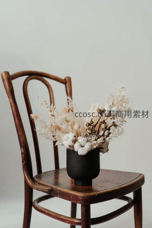 一把经典弧形木椅上摆放着一盆干花,木质纹理与植物质感相映成趣,传递出岁月沉淀下的温馨与宁静。