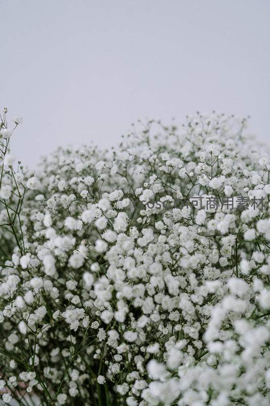 镜头聚焦于一片洁白的满天星花丛,细小的花朵密集绽放,如雪花般纯净,充满梦幻与浪漫气息。