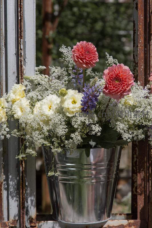 银色铁桶内插满粉红大丽花与白色满天星,置于斑驳旧窗框前,阳光洒落,洋溢着乡村田园的明媚生机。