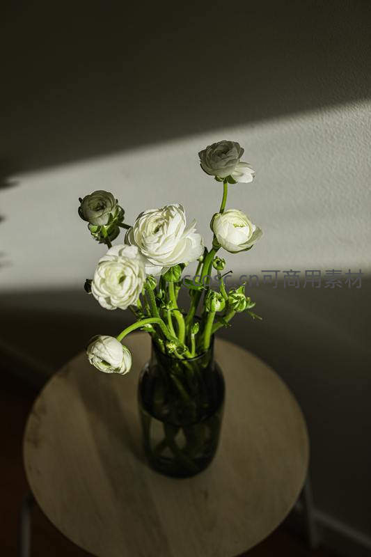 阳光透过窗户在墙面投下斜影,照亮深色玻璃瓶中的白色毛茛,花朵姿态各异,绿茎清晰可见,展现光影与自然交织的静谧美感。