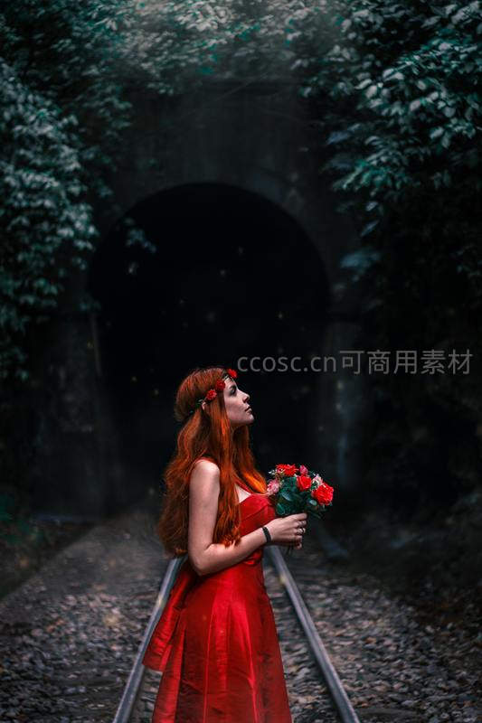 红裙女子手持玫瑰,伫立于绿意盎然的隧道铁轨上仰望天空。