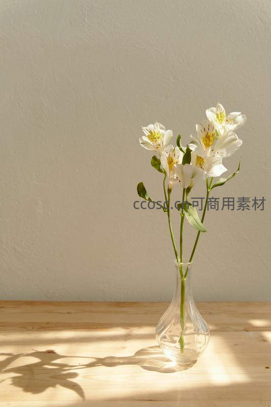 阳光洒在木质桌面上,白色六出花在玻璃瓶中静静绽放。