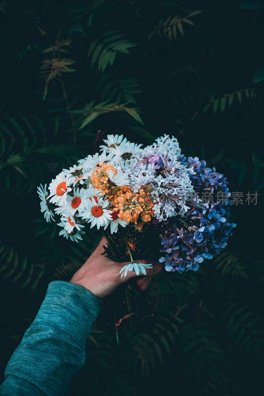 一只穿着蓝色衣袖的手捧着由雏菊、绣球和橙色小花组成的花束,背后是深绿色蕨类植物,充满自然生命力与野性美。