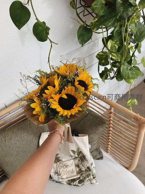 一只手提着鲜艳的向日葵花束,背景是垂落的绿萝和藤编座椅,帆布袋上印有“Good Vibes”,整体画面充满阳光与生活气息。