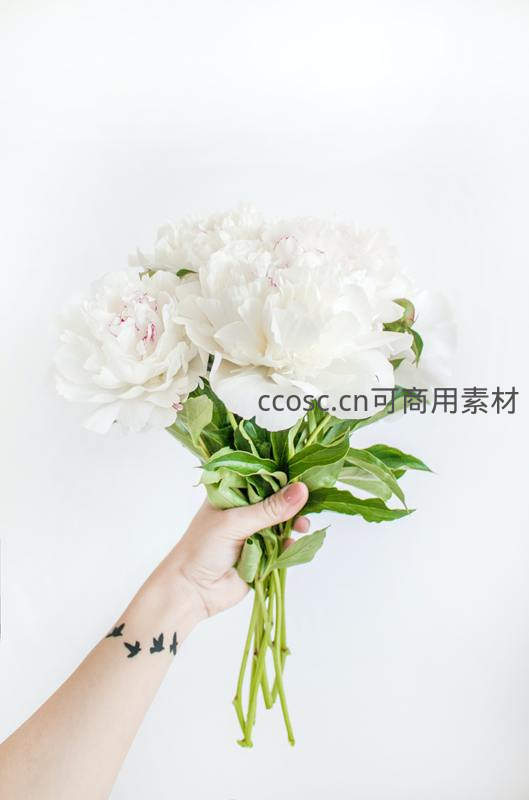 一只带有飞鸟纹身的手轻握一束洁白如雪的牡丹,纯白背景凸显花朵的高贵与纯净,尽显柔美气质。