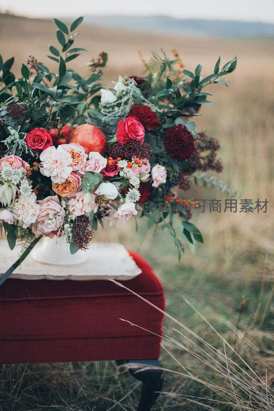 一束色彩斑斓的花艺作品摆放在野外的红色天鹅绒凳子上,背景是金黄的草地,阳光柔和,展现出一种优雅又充满自然气息的田园美学。