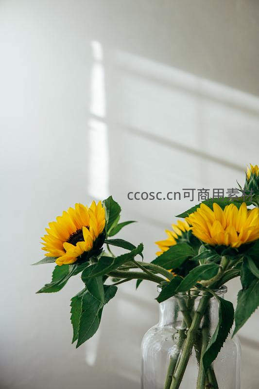 几支盛开的向日葵插在透明玻璃瓶中,阳光从窗外洒入,在洁白墙面上留下窗格光影,传递出明亮、温暖且充满生命力的居家氛围。