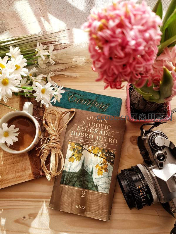 阳光洒在木质桌面上,一杯咖啡、一本小说、一台复古相机与一盆粉红风信子静静相伴,勾勒出悠闲惬意的午后文艺生活。