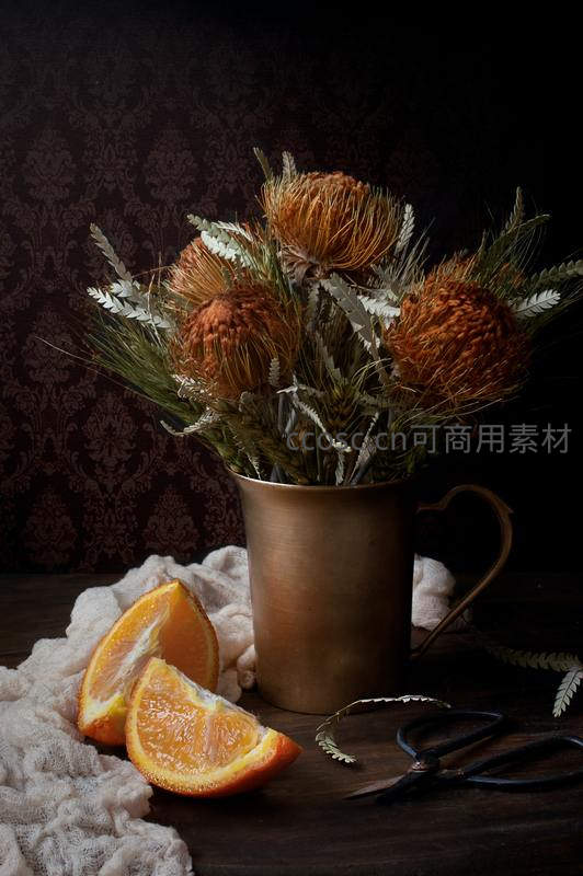 深色花纹背景前,铜质杯子盛放着棕褐色干花,旁置新鲜橙片与蕾丝布料,整体色调沉稳复古,充满艺术感与生活气息。