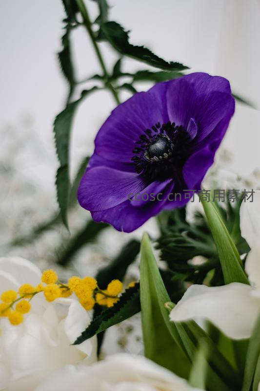 一朵盛开的紫色银莲花在镜头下展现出其细腻的花瓣纹理和深邃的黑色花蕊,周围点缀着白色与黄色的小花,充满生机与活力。