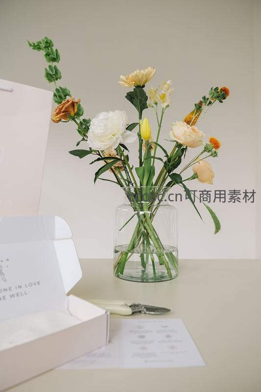 简约玻璃花瓶盛放白色牡丹与淡黄小花,旁置礼盒与剪刀,整体色调柔和,为室内空间增添自然与温馨气息。