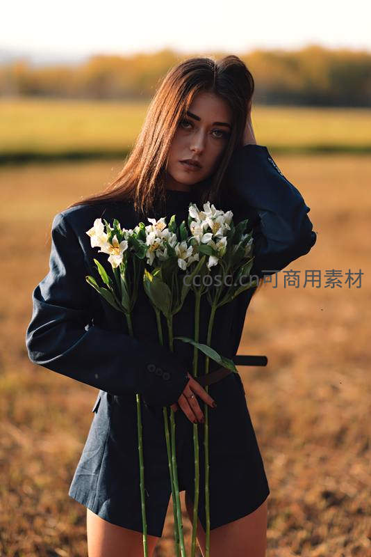 身着深色外套的女子立于金黄田野,手捧洁白百合,眼神专注,夕阳洒落,尽显秋日诗意与女性柔美力量。