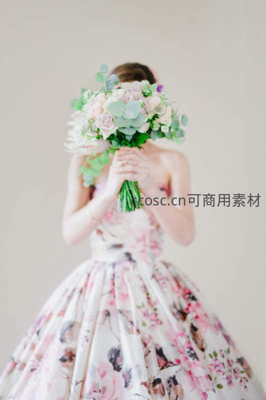 一位身着印有粉色花卉图案长裙的新娘,双手捧着一束由淡粉玫瑰和尤加利叶组成的花束遮住面容,姿态含蓄而充满诗意。