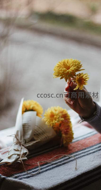 一只温柔的手轻握着几朵金黄雏菊,旁边是一本打开的书和更多花朵,它们被随意地放在条纹毛毯上,窗外景色朦胧,弥漫着悠闲惬意的气息。