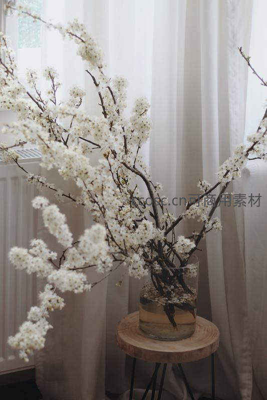 透明玻璃瓶内插着几支绽放的白色樱花枝条,置于原木小圆桌上,背景是柔和的白纱帘,整个画面充满春天的宁静与诗意。